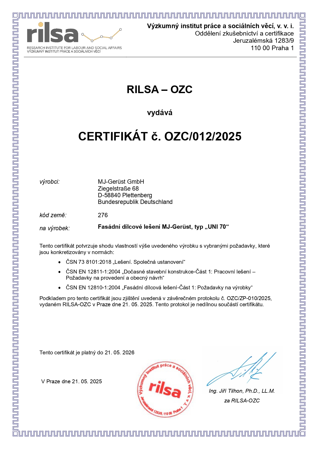Špičková bezpečnost: Lešení disponuje platným certifikátem RILSA (Výzkumný institut práce a sociálních věcí) s platností do roku 2026.