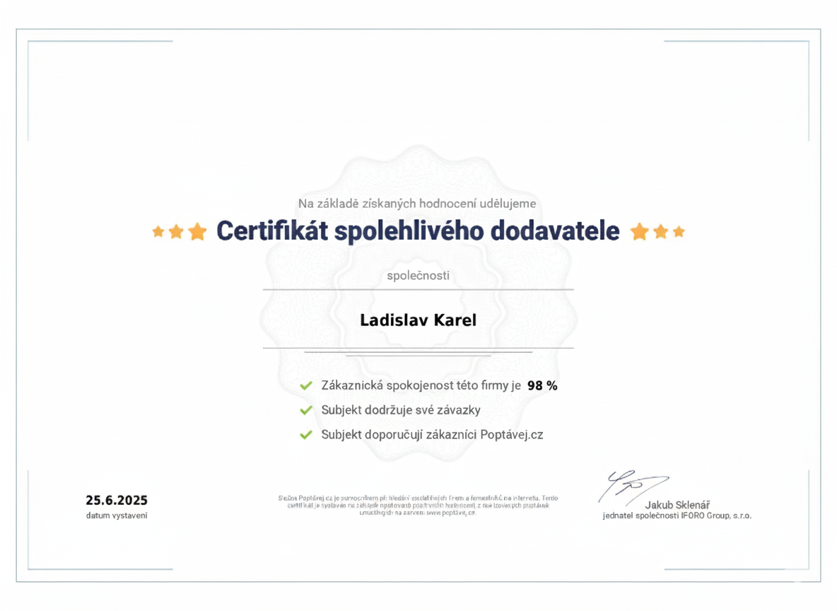 Naše práce mluví za nás, ale největší odměnou je pro nás spokojenost našich zákazníků. Na základě více než 20 ověřených hodnocení nasbíraných za posledních 5 let na portálu Poptávej.cz jsme získali prestižní certifikát spolehlivosti.